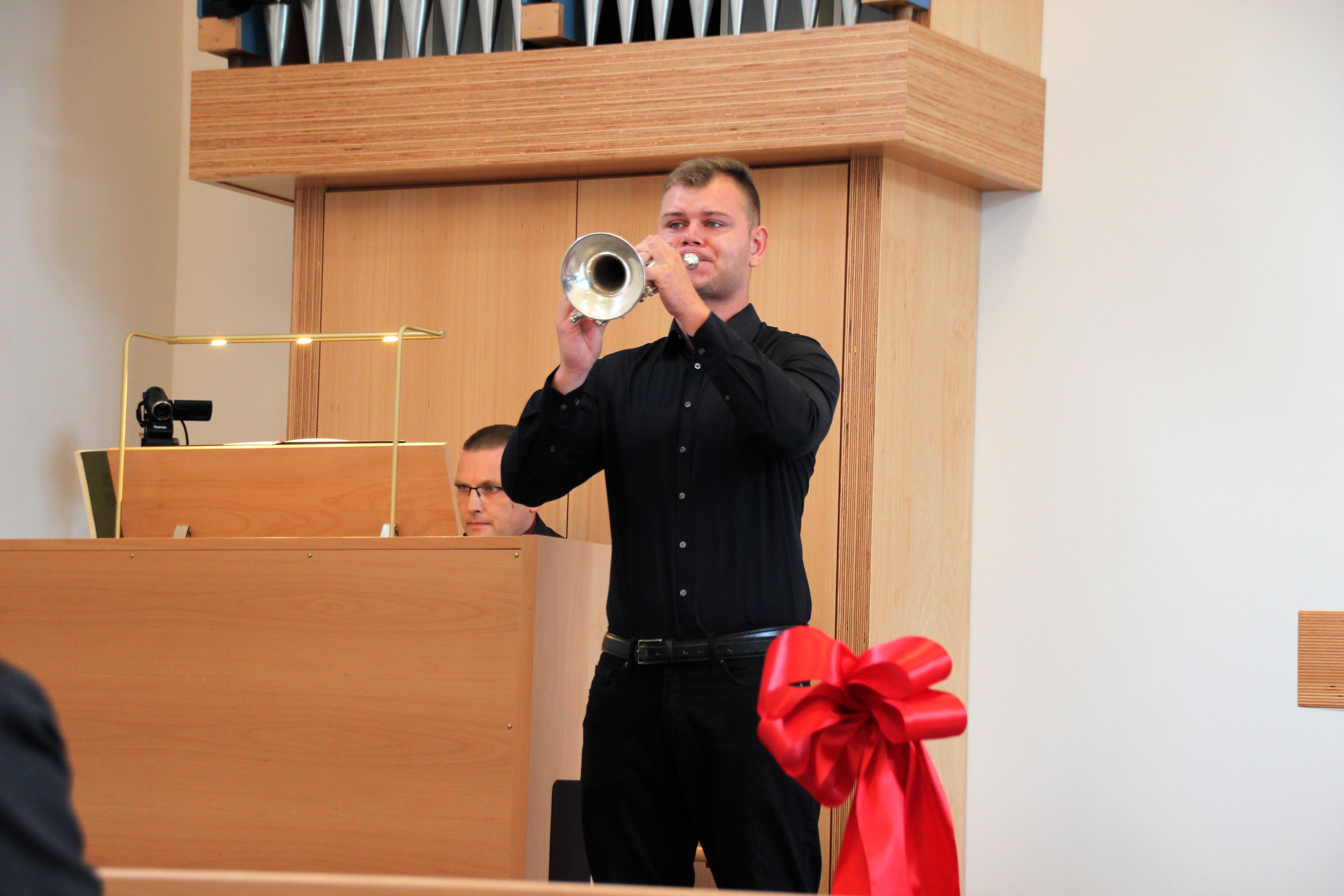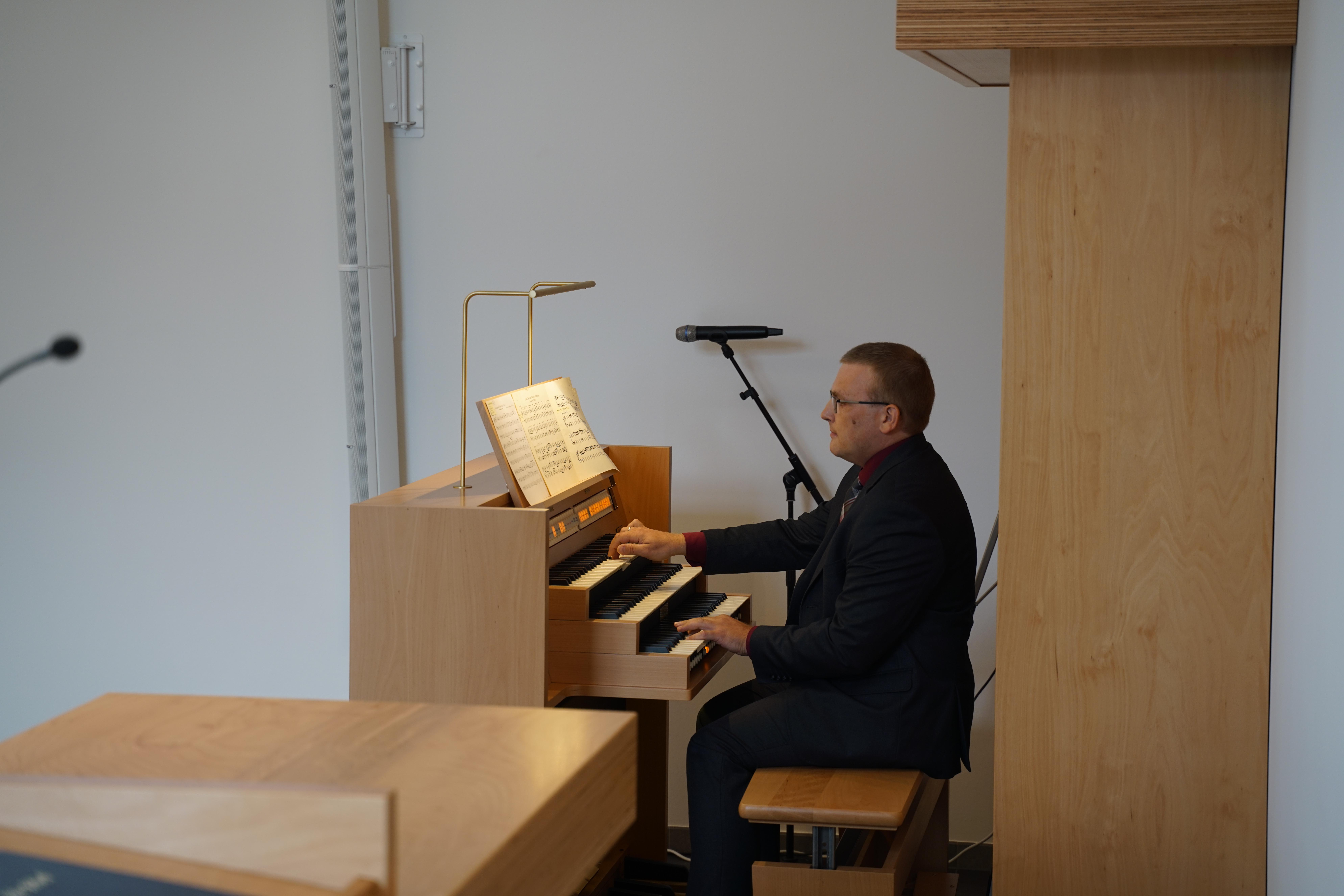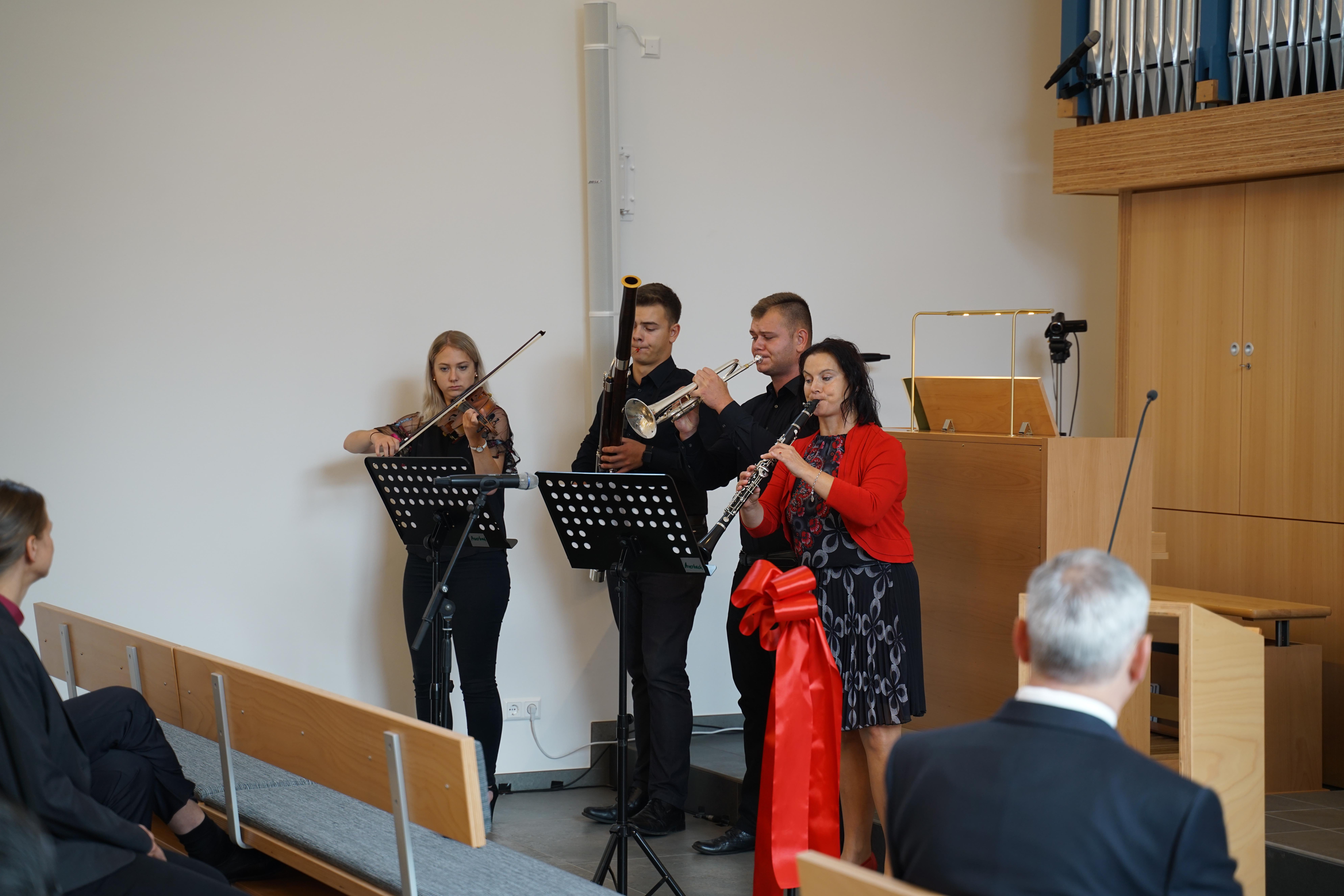 Neben den musikalischen Beiträgen der zur Gemeinde gehörenden Familie Fohlert ließ der Orgelbauer Michael Friedel von der kircheneigenen Orgelwerkstatt die neue, digitale Pfeifenorgel in ihrer Klangvielfalt erklingen und wies auf die zentrale Bedeutung der Orgel für die Mitgestaltung der Gottesdienste und das musikalische Wirken darüber hinaus hin. Diese Orgel ist kein spektakuläres Instrument, hat aber viel im Verborgenen. Das hörte man schon anhand der wenigen Klängen seines Anspielens.