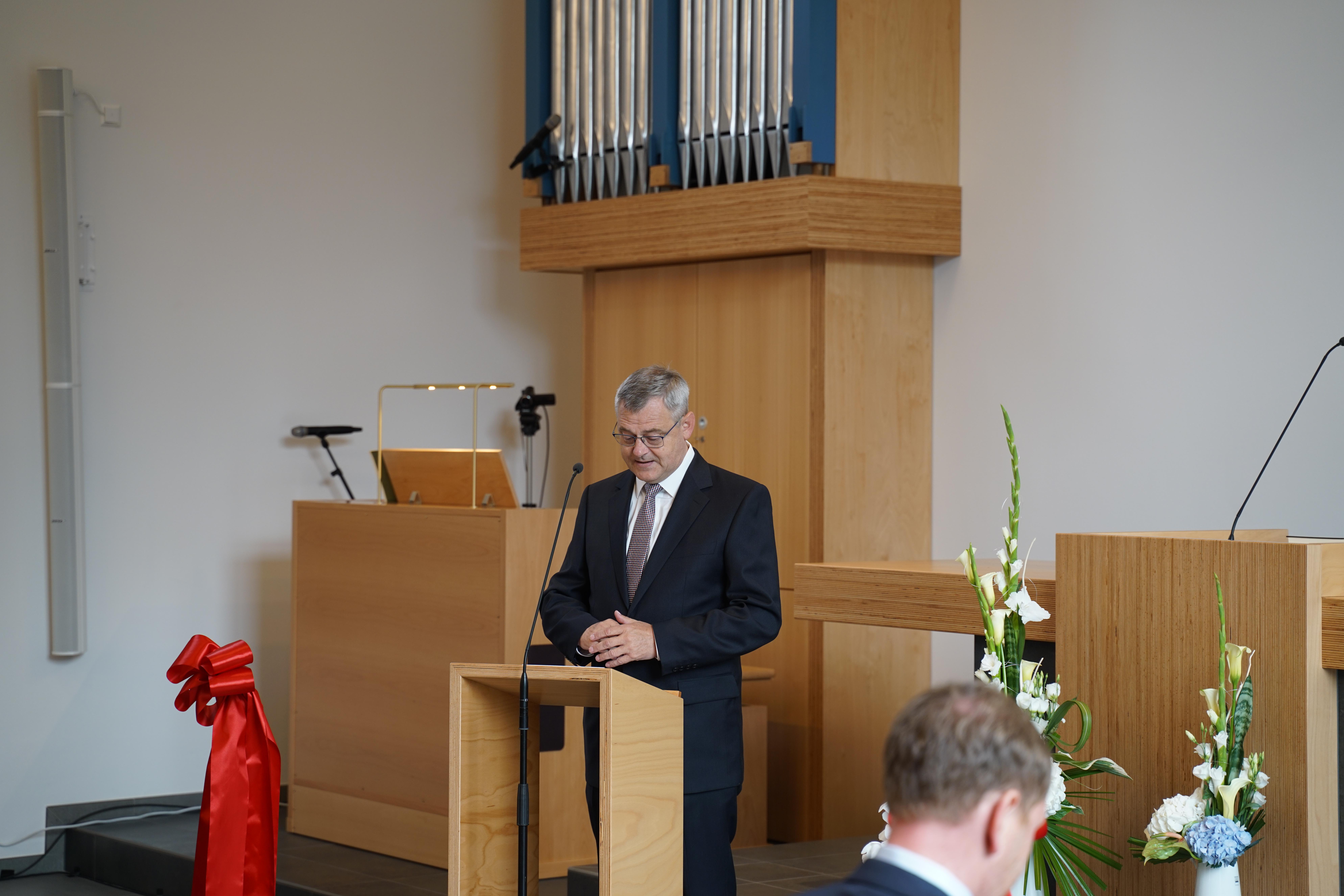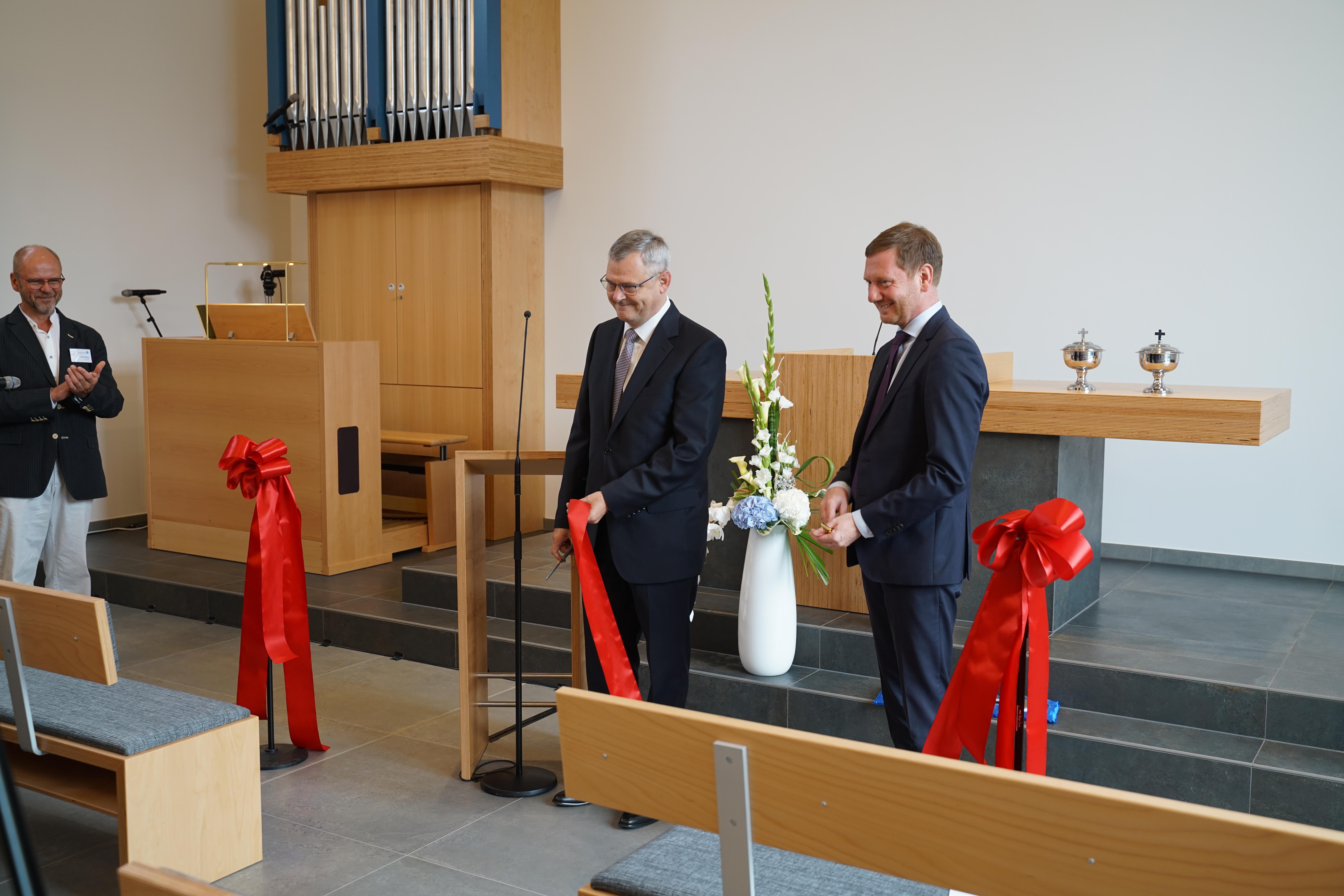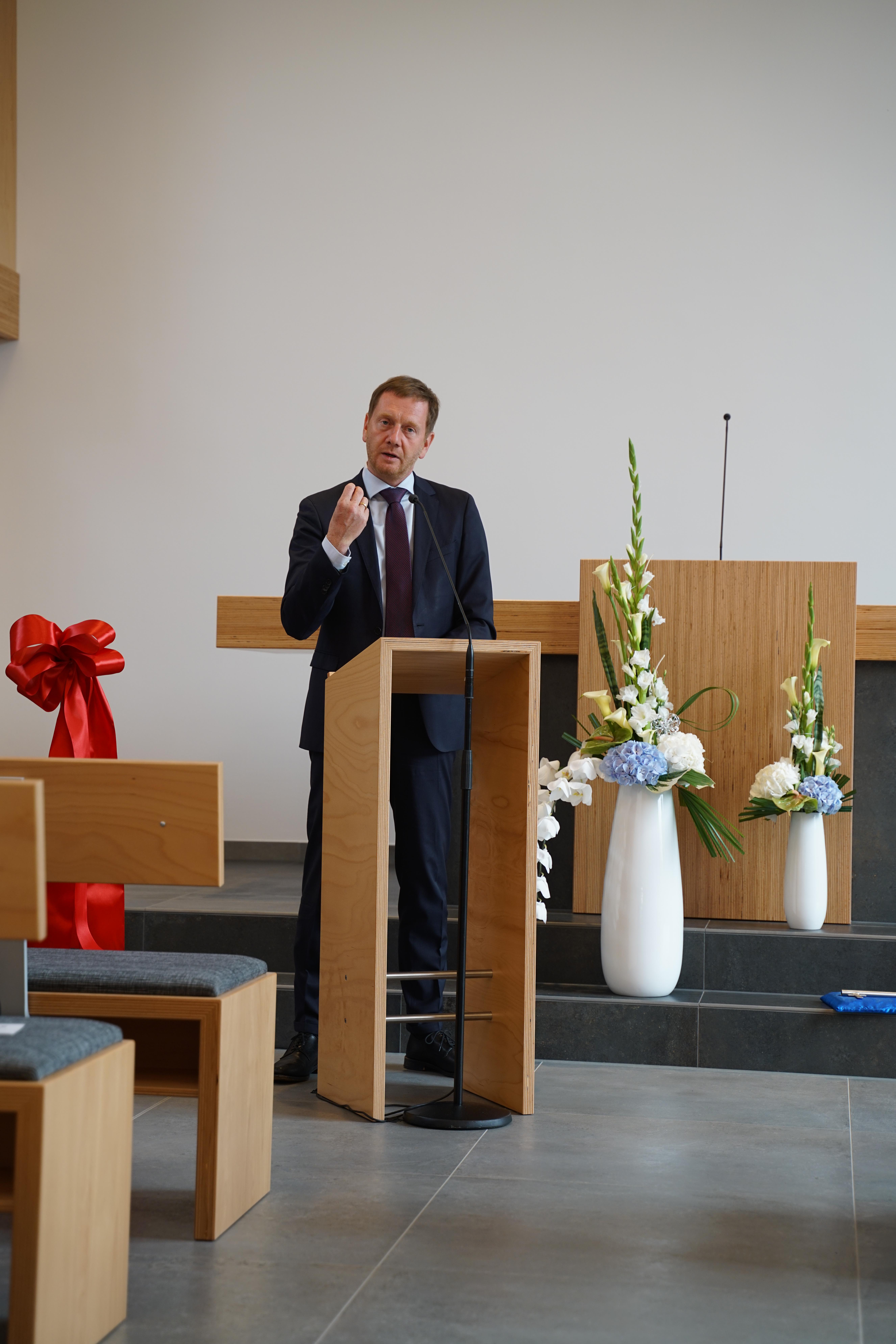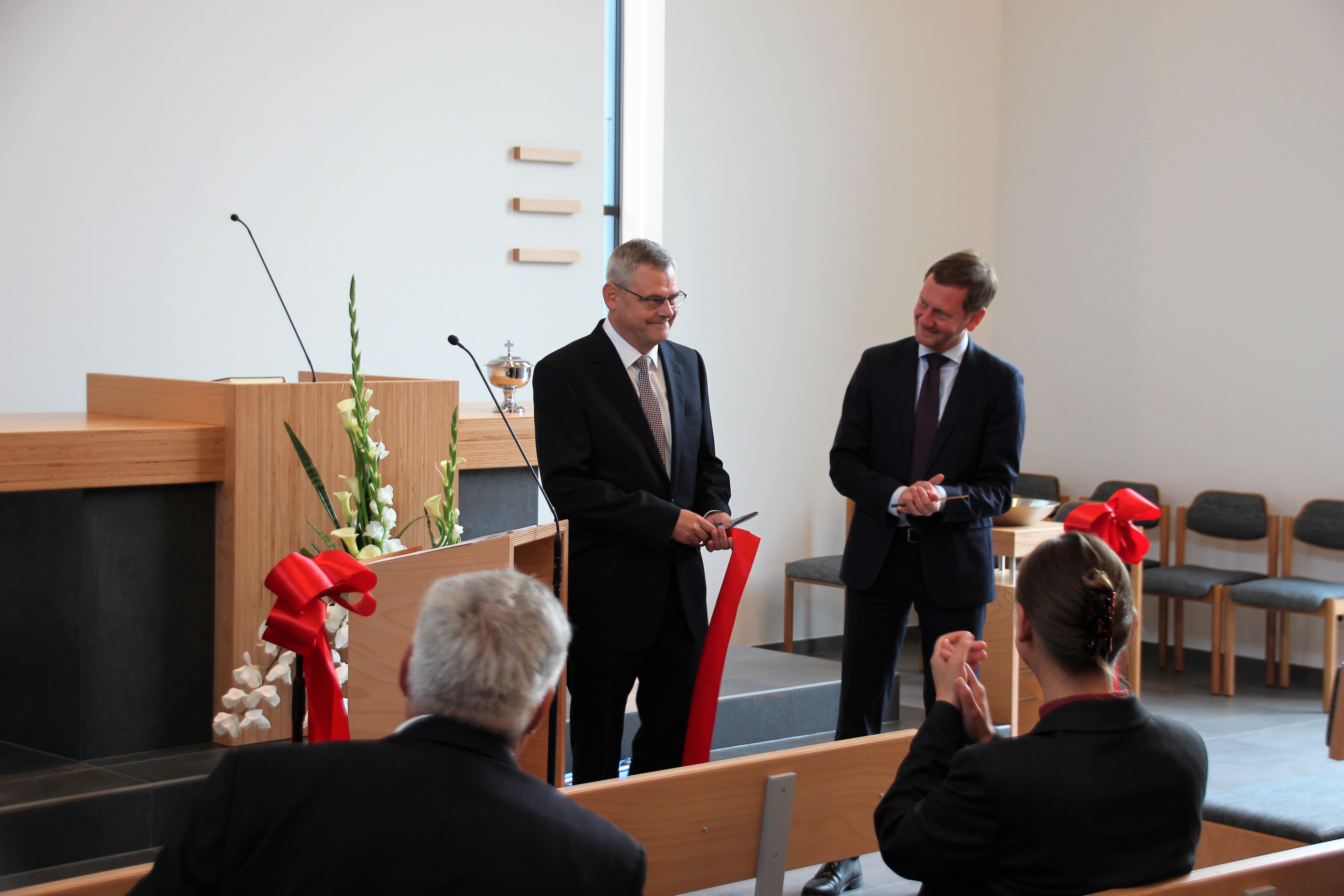 Damit drückte der Ministerpräsident u.a. aus, dass er von diesem gelungenen Bau, den gut gepolsterten Bankreihen und der Kirche angetan ist. In seiner Grußbotschaft war ihm besonders die seitens der Verfassung Sachsens und des Grundgesetzes ermöglichte Religionsfreiheit und das mögliche religiöse Leben wichtig. Aus eigenen Erfahrungen haben ihm sein Glaube und die damit verbundene Wertevermittlung im Leben geholfen. Er wünschte der Gemeinde, dass sie Verantwortung in der Region und den Mitmenschen gegenüber, verbunden mit einer aktiven Jugendarbeit, übernehmen kann.
