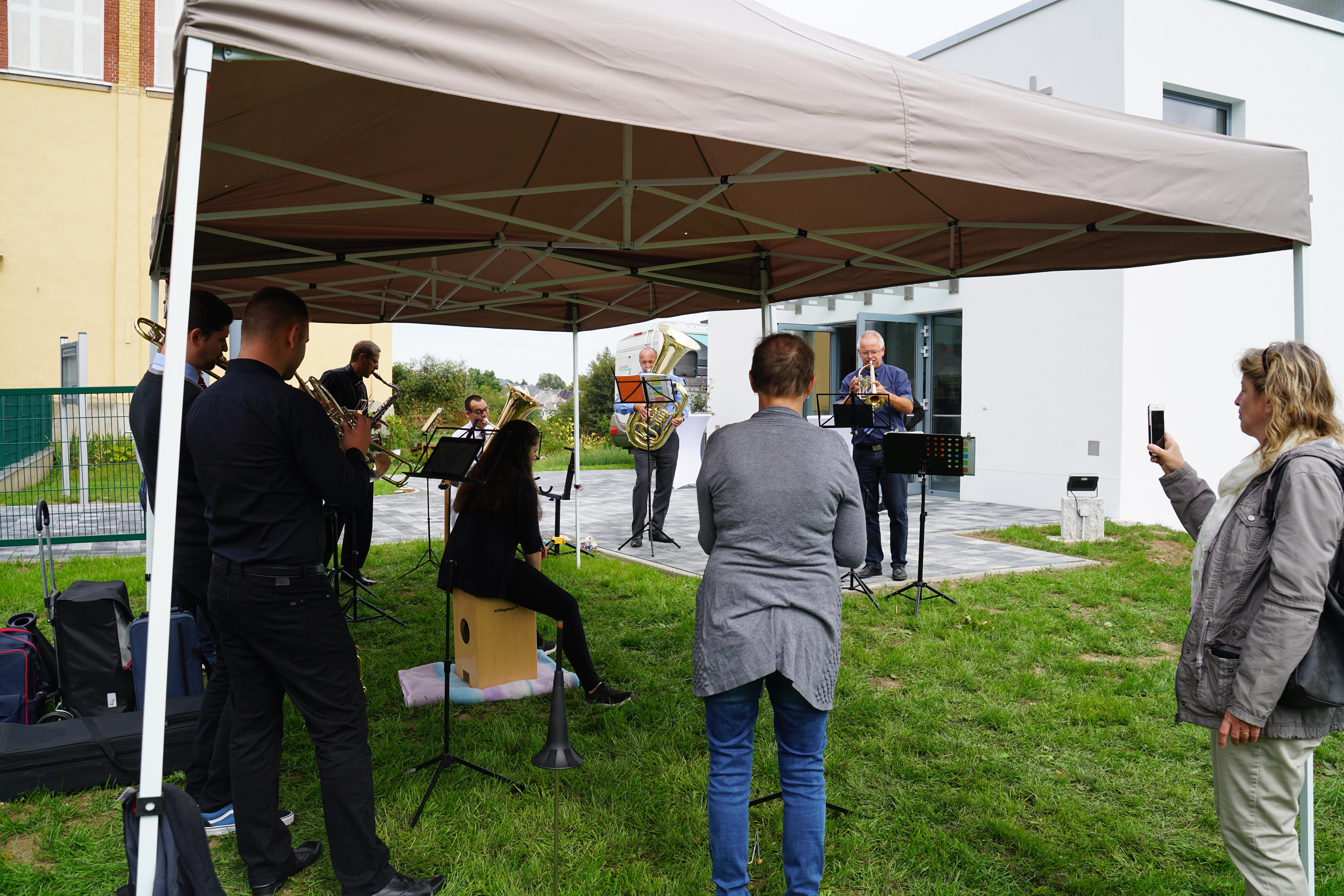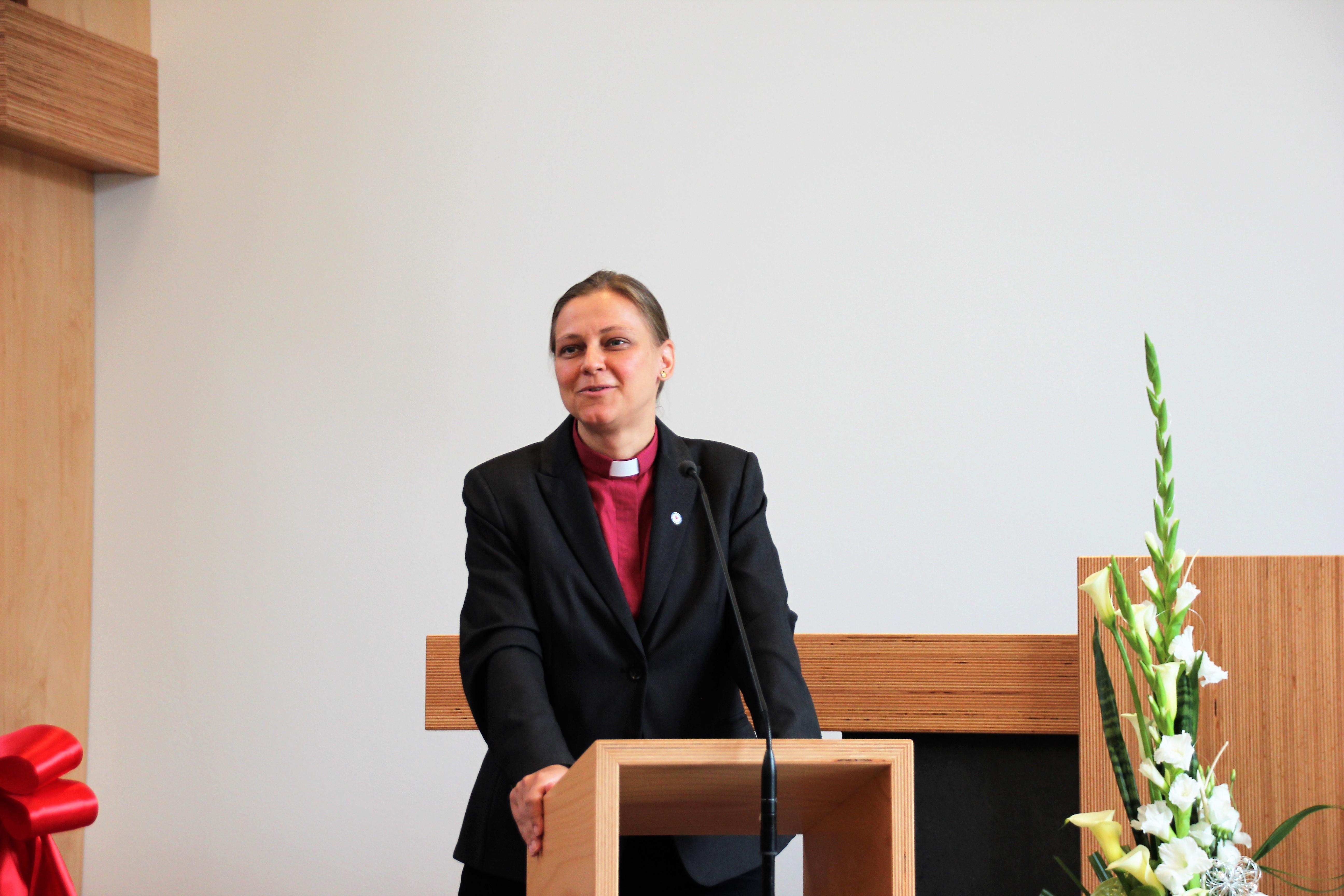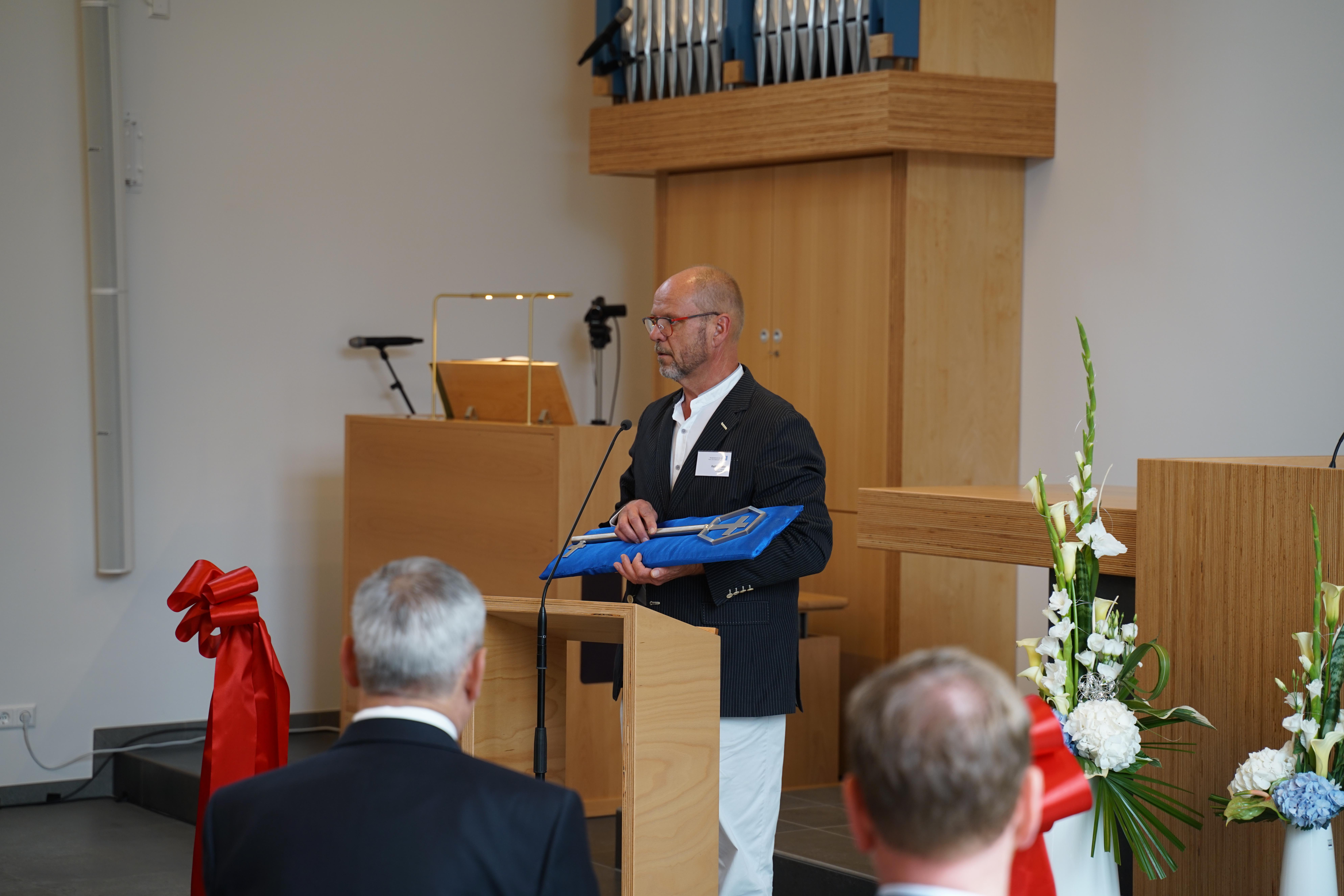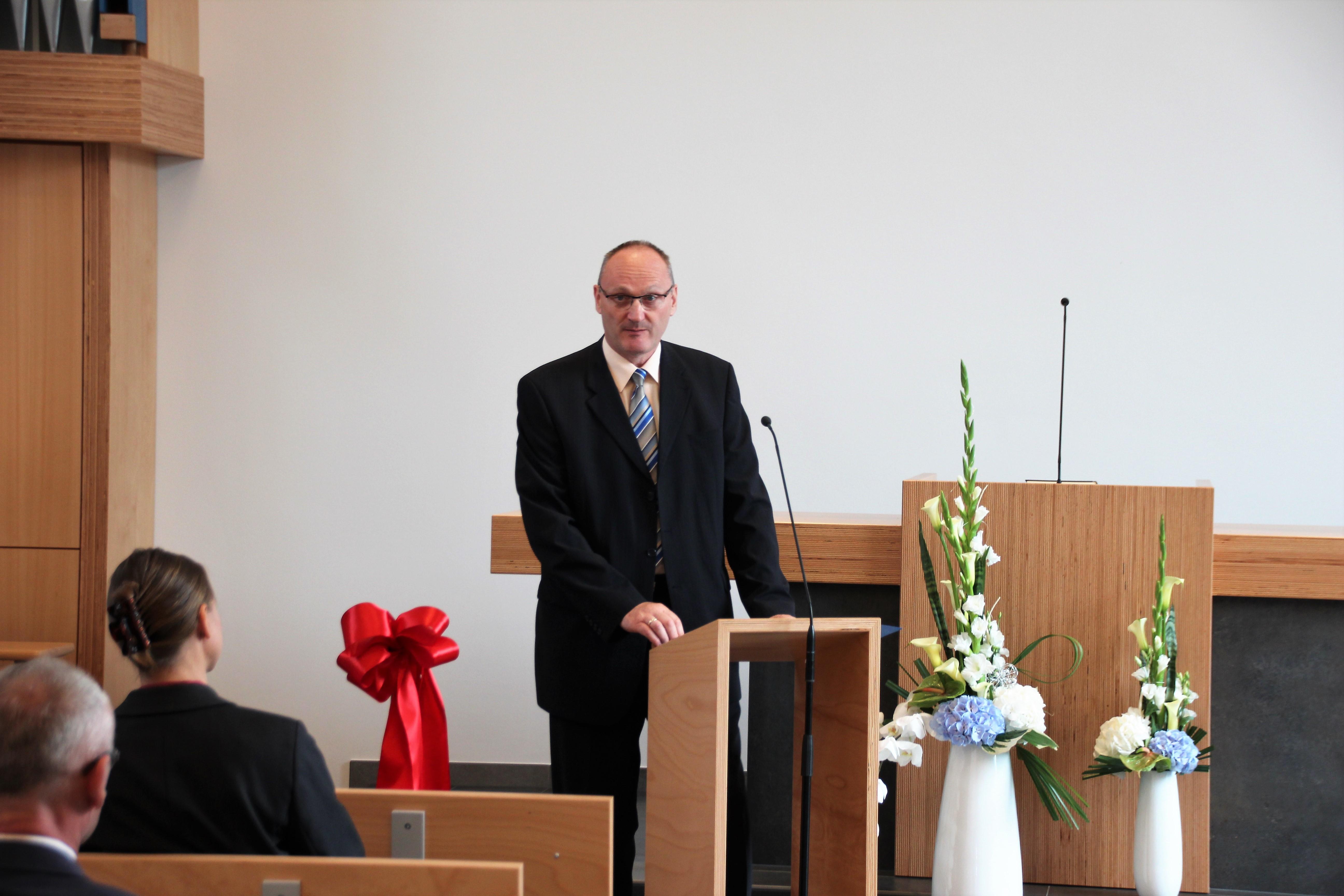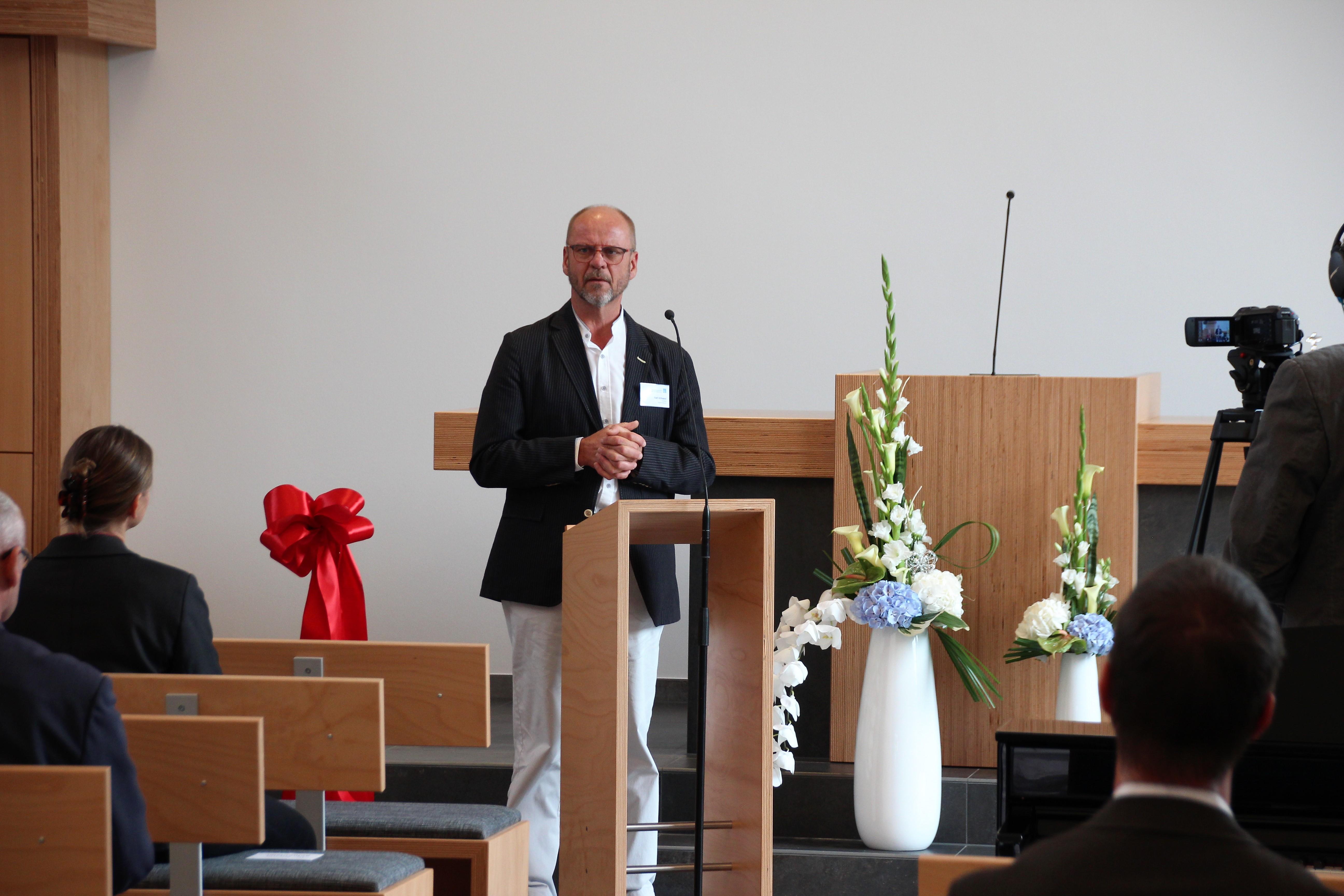 Der als Moderator fungierende Architekt konnte weitere Grußworte ankündigen. So betonte u.a. Pfarrerin Dr. Nicola Schmutzler von der Ev.-Luth. Kirchgemeinde in Auerbach, dass die Gemeinde hier glücklich sein kann. Gott möge immer mit seiner lebenspendenden Kraft da sein. Hier ist ein Ort entstanden, so betonte sie, wo Glaubensgeschwister und Mitmenschen Lust an dem Gesetz des Herrn bekommen (anlehnend an Psalm 1), immer auftanken können und versorgt werden.