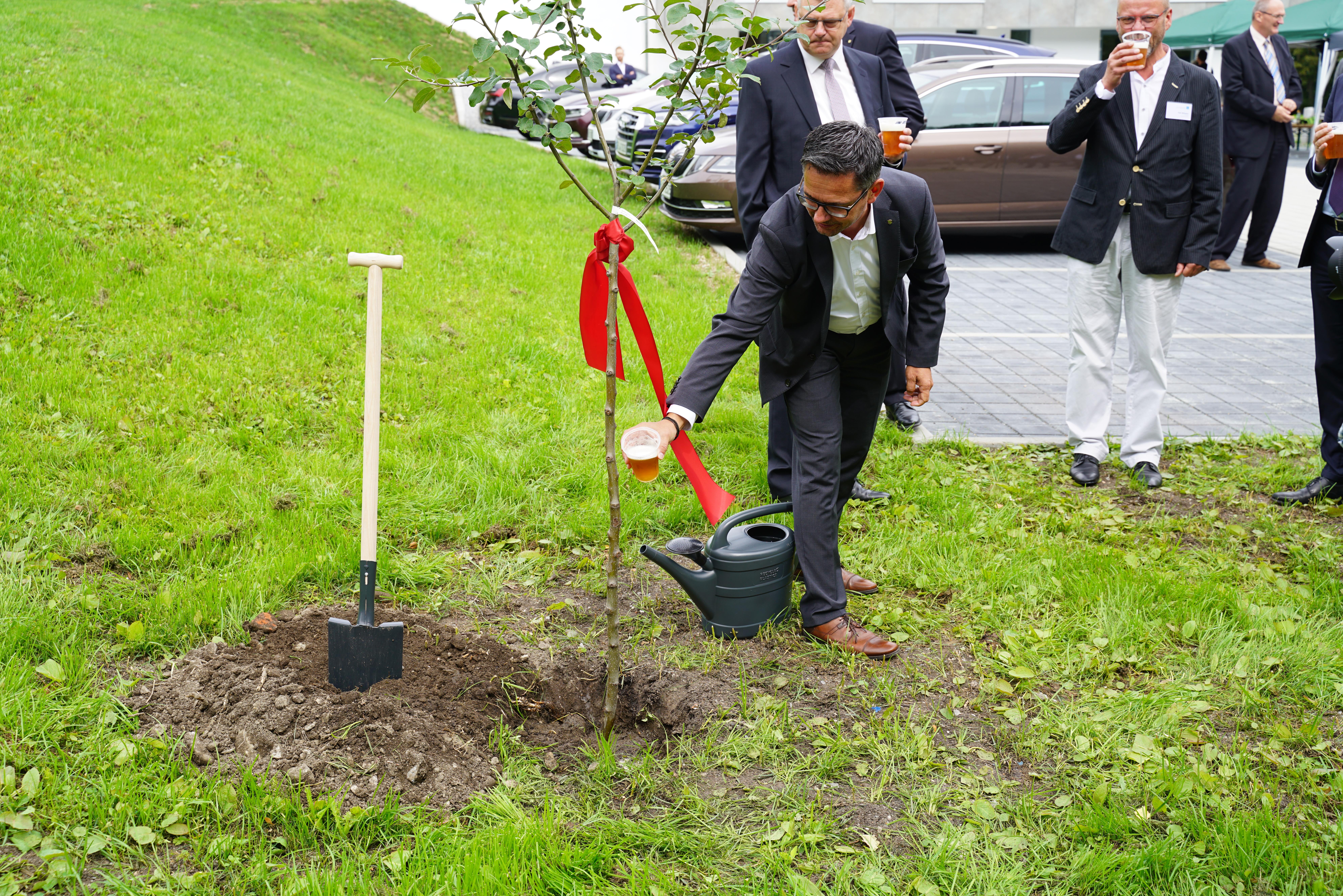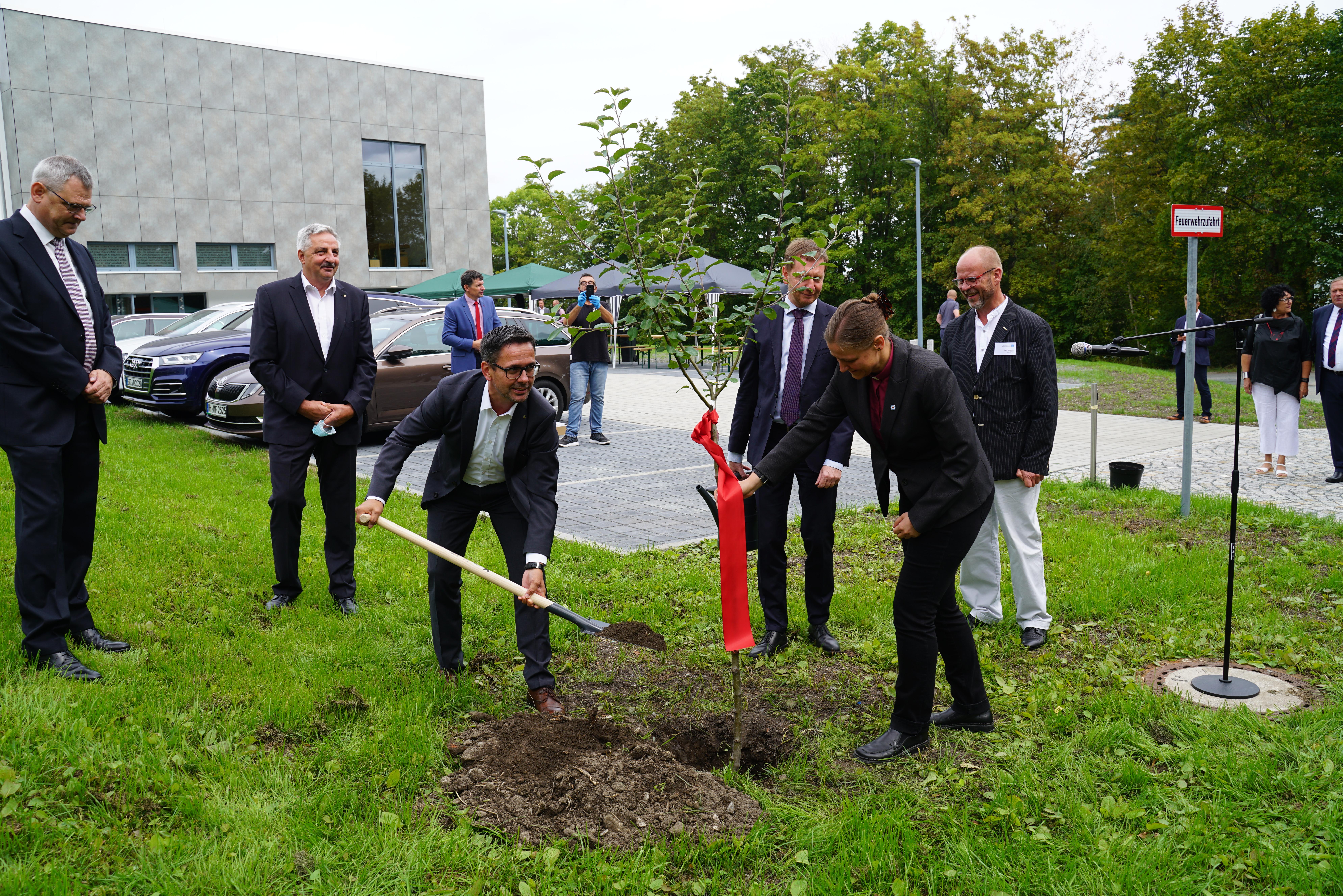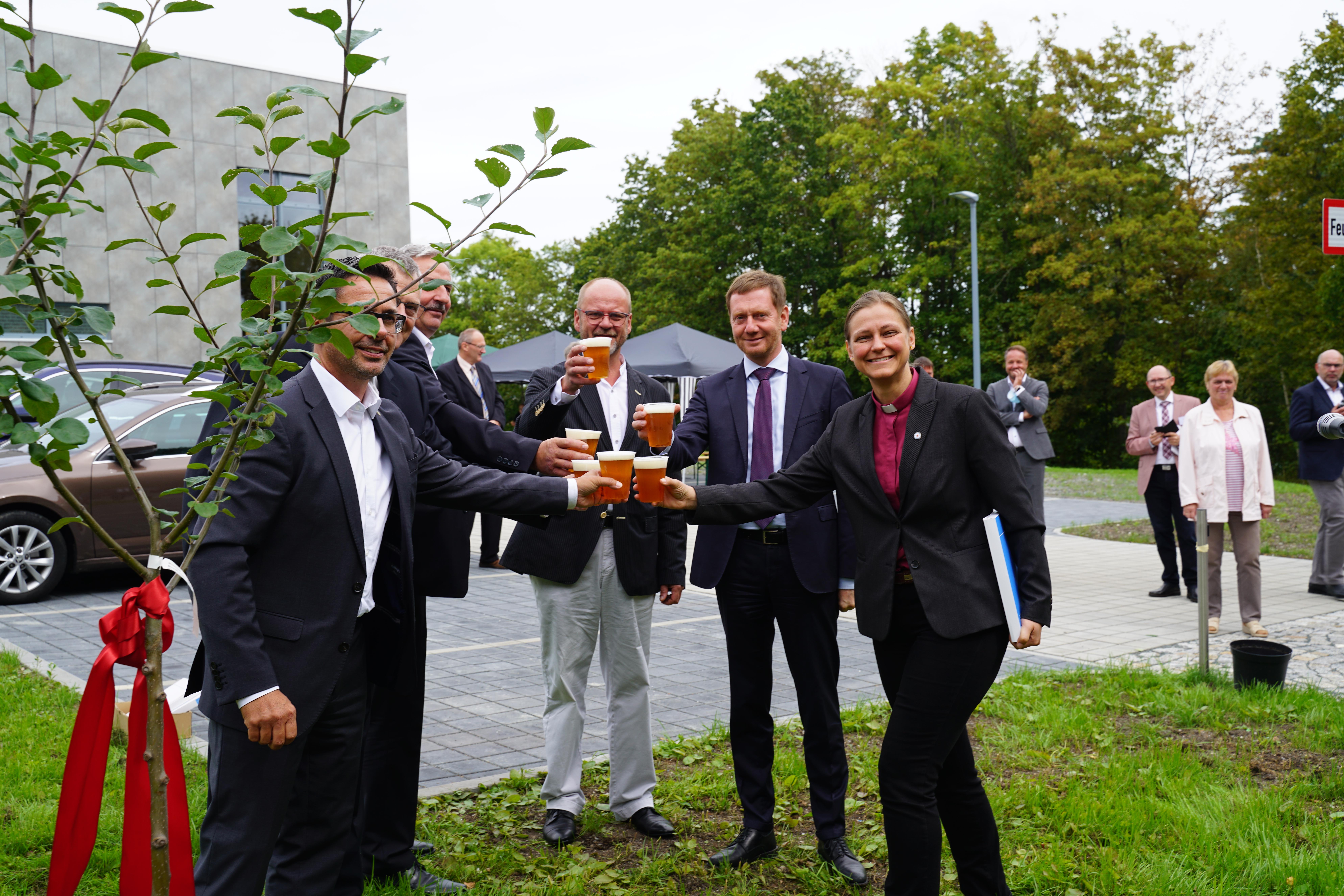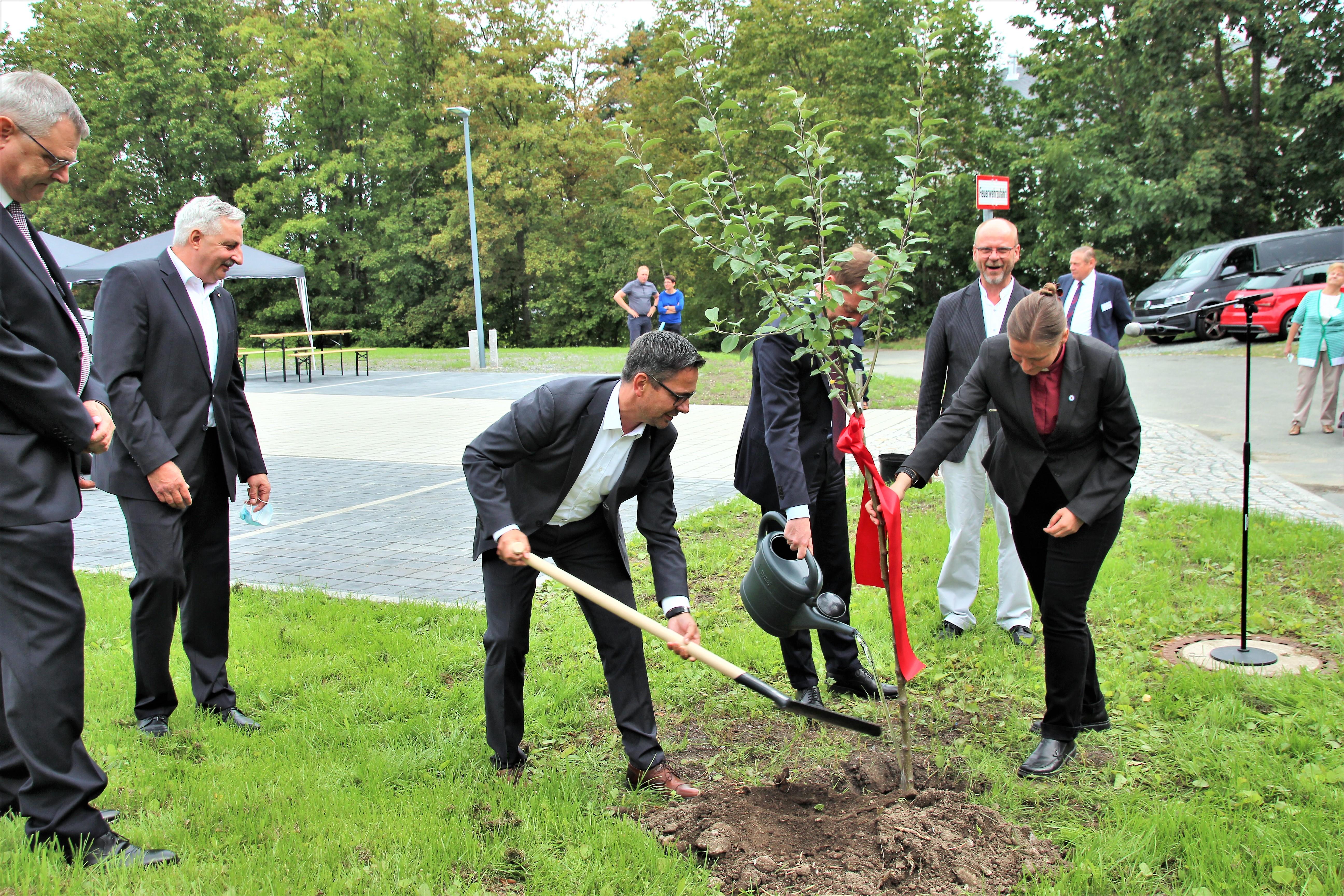 Nach einem kurzen Rundgang mit dem Ministerpräsidenten durch die vielen funktionalen Räume, die ein aktives Gemeindeleben außerhalb der Gottesdienste ermöglichen, pflanzten die prominenten Ehrengäste einen Apfelbaum. Dies war ein gemeinsames Geschenk des Ministerpräsidenten Michael Kretschmer, des Oberbürgermeisters der Stadt, Manfred Deckert, des Landtagsabgeordneten Sören Voigt und der bereits erwähnten Pfarrerin.