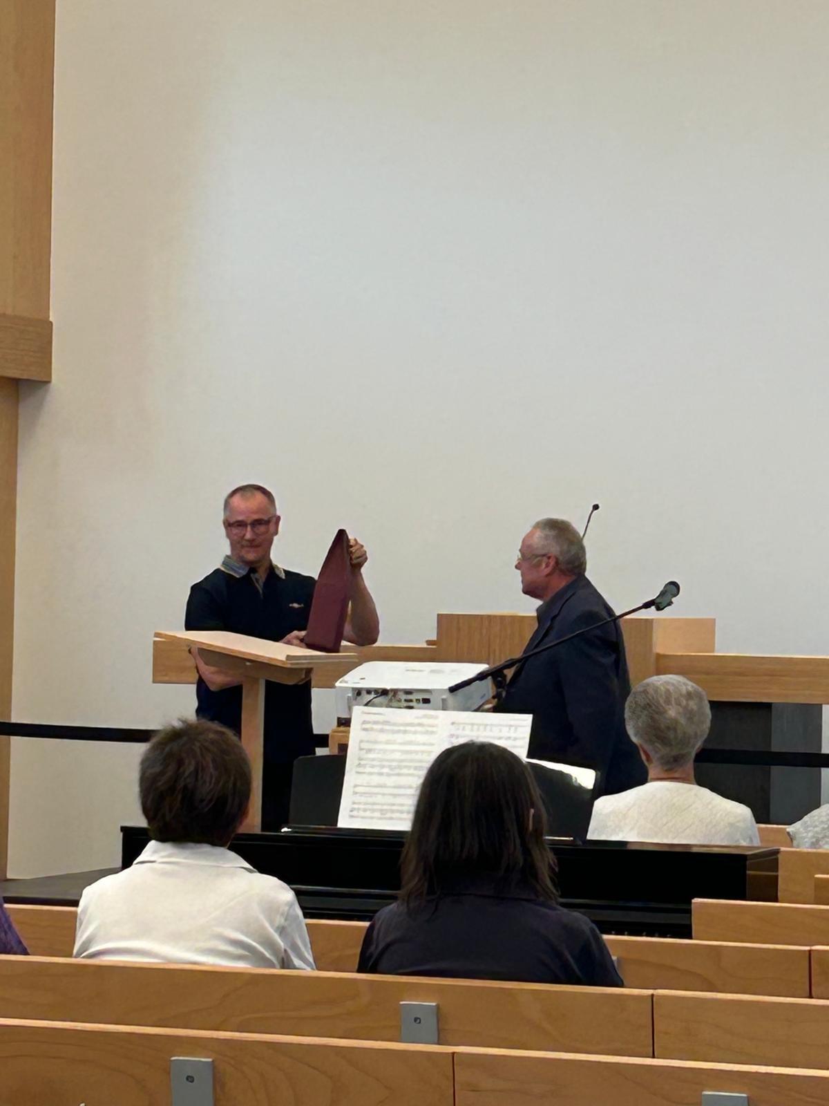 Dann war es soweit: Die Türen der Kirche öffneten sich. Weithin sichtbar kündeten bereits am Eingang aufgestellte Beachflags, dass hier etwas los ist. Gemeindevorsteher, Hirte Uwe Herrnmann, begrüßte die Besucher und sprach eingangs ein Gebet. Dann eröffeneten Chor und Gäste gemeinsam diesen "Tag der offenen Tür" mit dem Kanon "Lobe den Herrn" (Kinderliederbuch "Stimmt mit ein", Nr. 53 ). Dem folgte das Lied "Singt ein Lied von Gott".